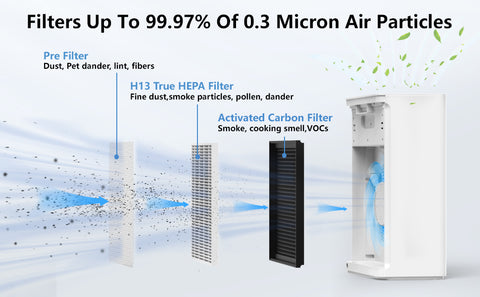 - ★【H13 True HEPA Filter】VEWIOR air purifier with the 3-stage filtration comprising a pre-filter, HEPA filter, and an activated carbon filter. Efficiently purify PM 2.5, VOCs, pollen, smoke, pet dander, and dust. It detects air quality and displays PM2.5 (Reference value)on the panel to ensure comfortable fresh air. We recommend replacing the filter every 3-6 months to ensure the optimum performance of the air purifier.